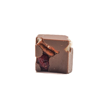A milk chocolate square sprinkled with canberry, mango and pecan