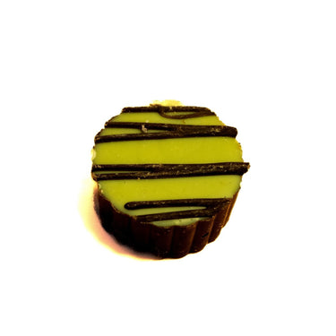 Ingredients: dark chocolate (cocoa mass, sugar, cocoa butter, emulsifier – SOYA lecithin, natural vanilla flavouring), white chocolate (sugar, cocoa butter, whole MILK powder, emulsifier - SOYA lecithin, natural vanilla flavouring), sugar, butter (MILK), lime puree (sugar, glucose syrup, lemon rind, flavours, citric acid, pectin), glucose, sorbitol, citric acid, colours – cocoa butter, E140, E100, E555, E171, E102, E133