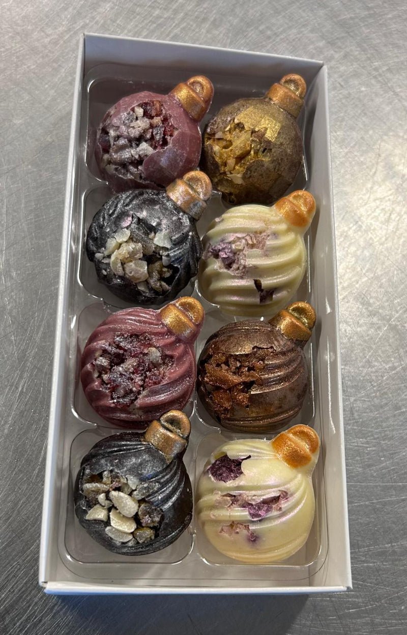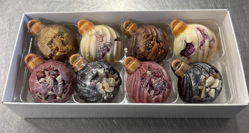 Each shimmering bauble is handmade in our Chocolate Den and brushed with gold and silver lustre for a truly magical finish. Inside every box you’ll find eight miniature delights – two of each of our carefully crafted flavours, inspired by the flavours and colours of Christmas: