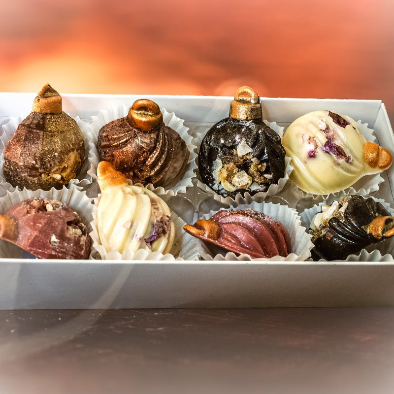 Each shimmering bauble is handmade in our Chocolate Den and brushed with gold and silver lustre for a truly magical finish. Inside every box you’ll find eight miniature delights – two of each of our carefully crafted flavours, inspired by the flavours and colours of Christmas: