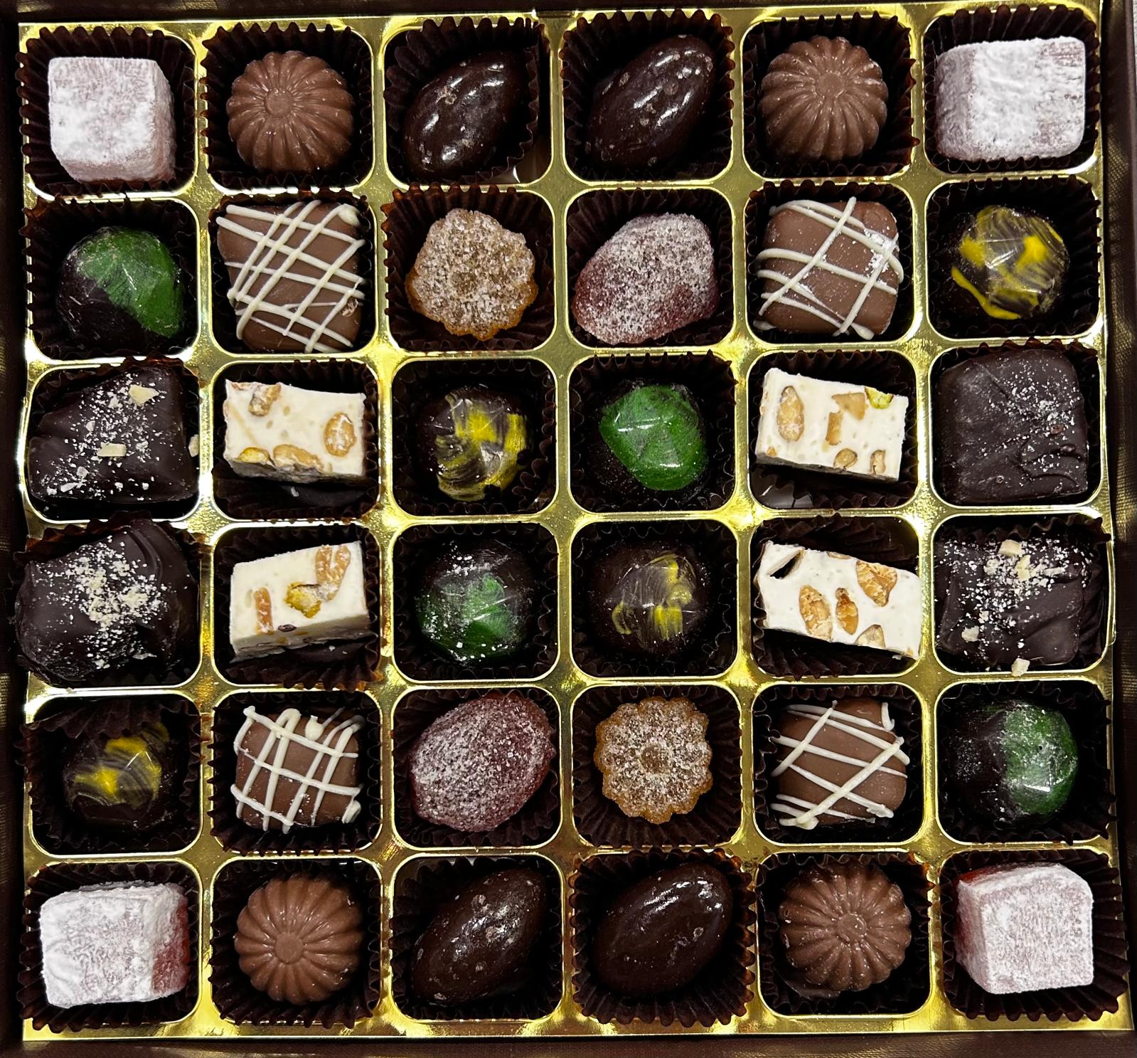 Milk chocolate (sugar, cocoa butter, whole MILK powder, cocoa mass, emulsifier – SOYA lecithin, natural vanilla flavouring), WALNUT, PECAN, PISTACHIO, caramelised HAZELNUT (HAZELNUTS 70%, sugar) dried pineapple (pineapple, sugar, E330, E223), dried cranberries (cranberries, cane sugar, sunflower oil), sultana, SULPHUR DIOXIDE