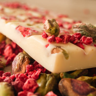 - Raspberry & Pistachio: A beautiful balance of fruity and nutty flavours in white chocolate